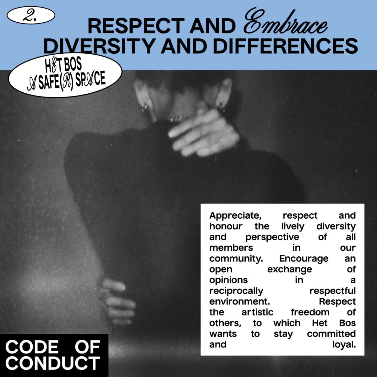 Welcome to Het Bos. Since evereybody is welcome at Het Bos, we want everyone to actually feel welcome at Het Bos. We're trying to accomplish this by a policy which is the result of a long and intense process and that we enrolled from September 2024.