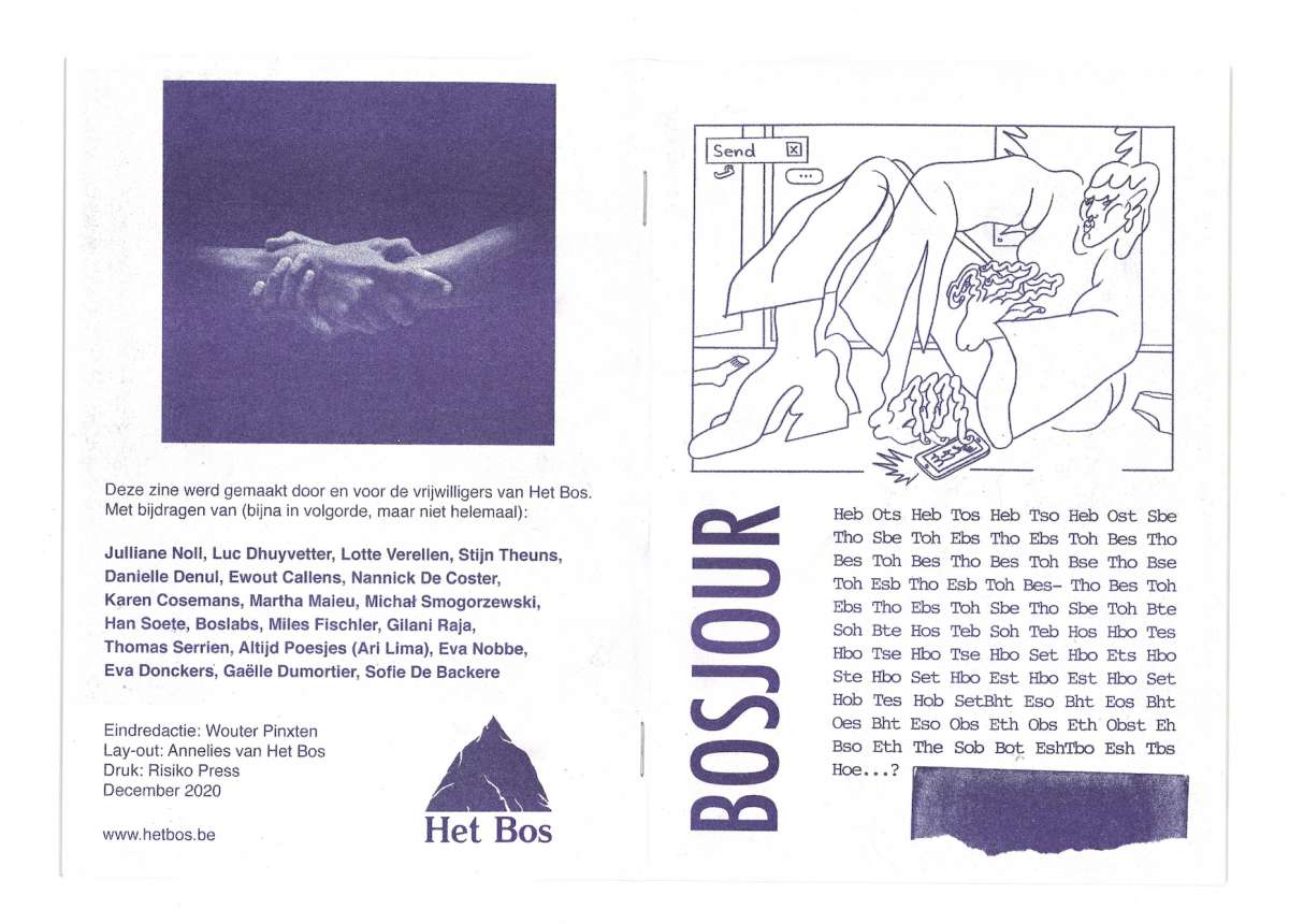 Via die rode draadjes vroegen we hen iets in te zenden voor een heuse zine die op democratische wijze 'BOSJOUR' werd gedoopt. Het ding is gemaakt door en enkel voor Bosvrijwilligers. Ouwe trouwe Risiko Press drukte het in beperkte oplage.